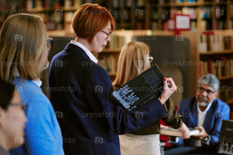 Кавказская женщина среднего возраста, ожидающая в очереди во время мероприятия по подписанию книг