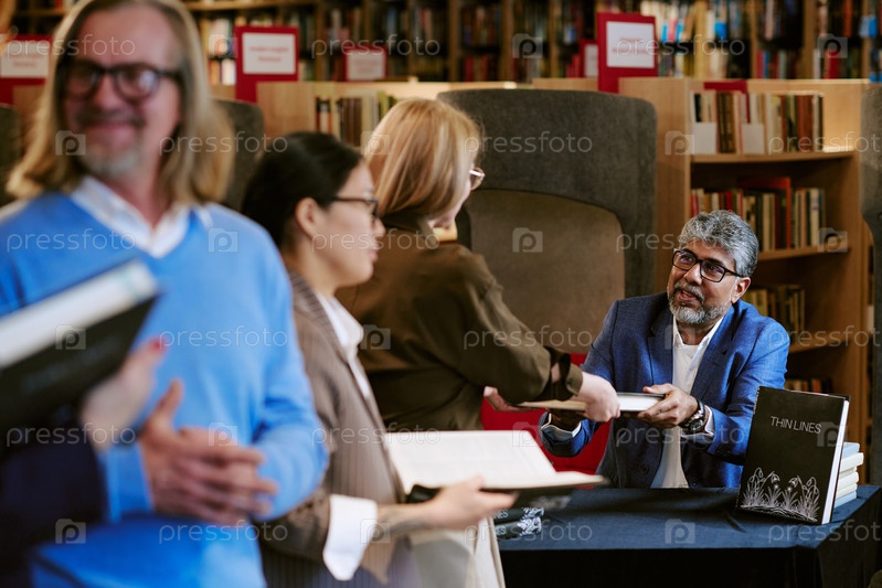 Южноазиатский мужчина средних лет подписывает книгу для белой женщины на презентации