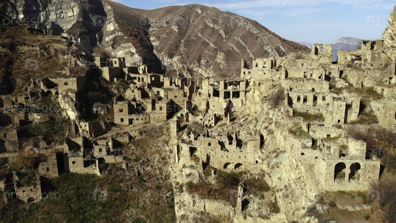 Разложившиеся каменные дома с обрушенными стенами и открытыми дверями посреди горного пейзажа под теплым полуденным солнцем