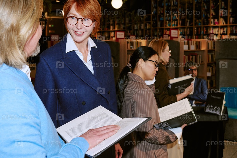 Кавказская женщина средних лет общается с различными коллегами во время презентации книги