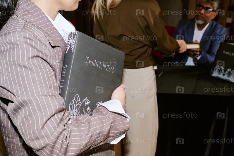 Молодая женщина держит книгу, в то время как автор подписывает копию во время презентации