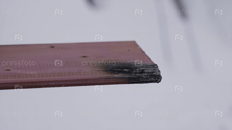Видео показывает крупный план дерева, пострадавшего от пожара. Пламя вспыхивает, нагревая древесину, которая обжигается и теряет куски. Дым поднимается, указывая на трансформацию и последствия горения