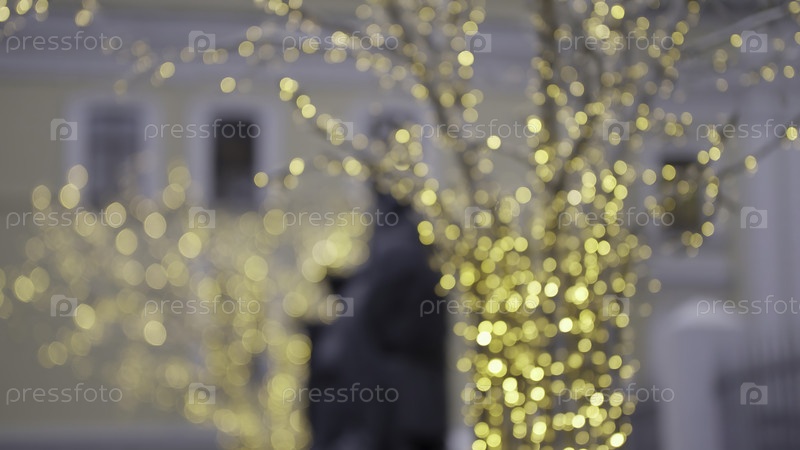Золотые рождественские огни мерцают на ветвях городских деревьев