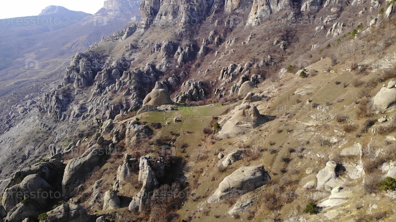 Вид с воздуха, летящий над скалистой горной долиной