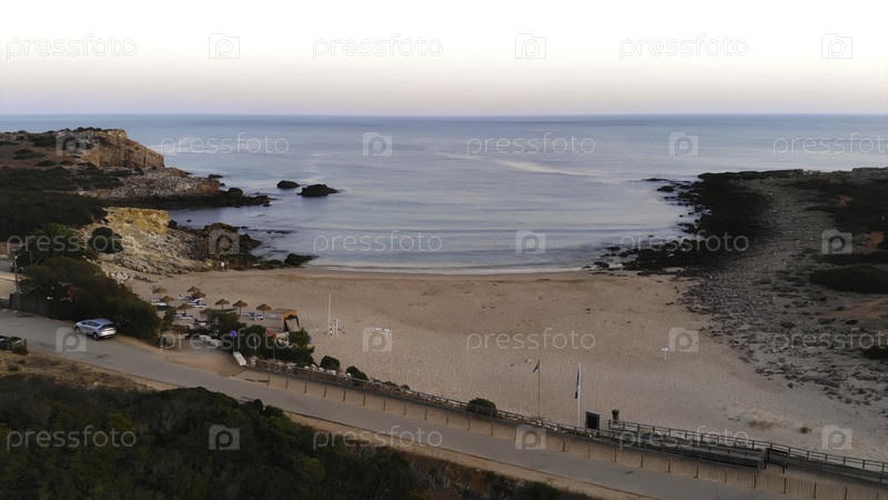 Нежные волны обходят тихий пляж на восходе солнца, спокойная приморская сцена с мягким небом и припаркованными автомобилями
