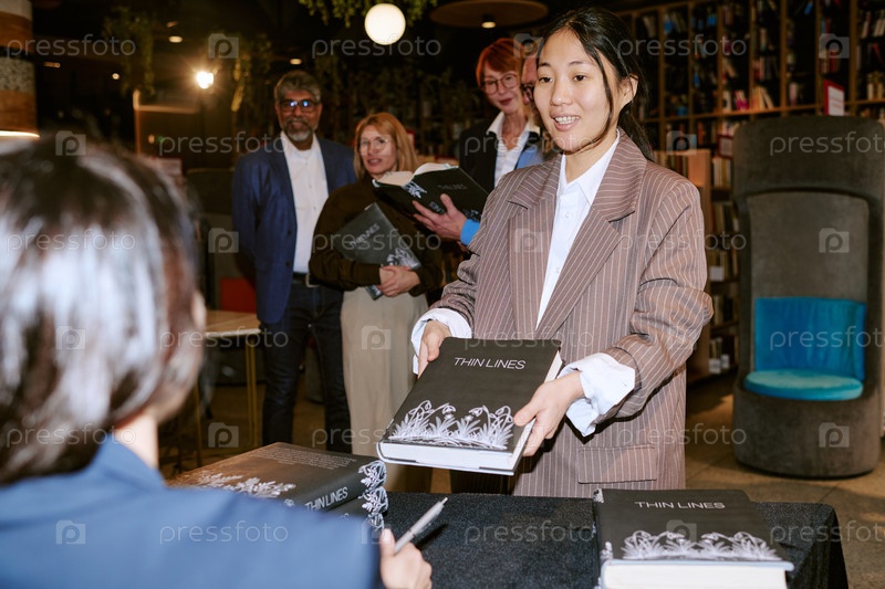 Молодая азиатская женщина вручает книгу во время мероприятия по подписанию автора в книжном магазине