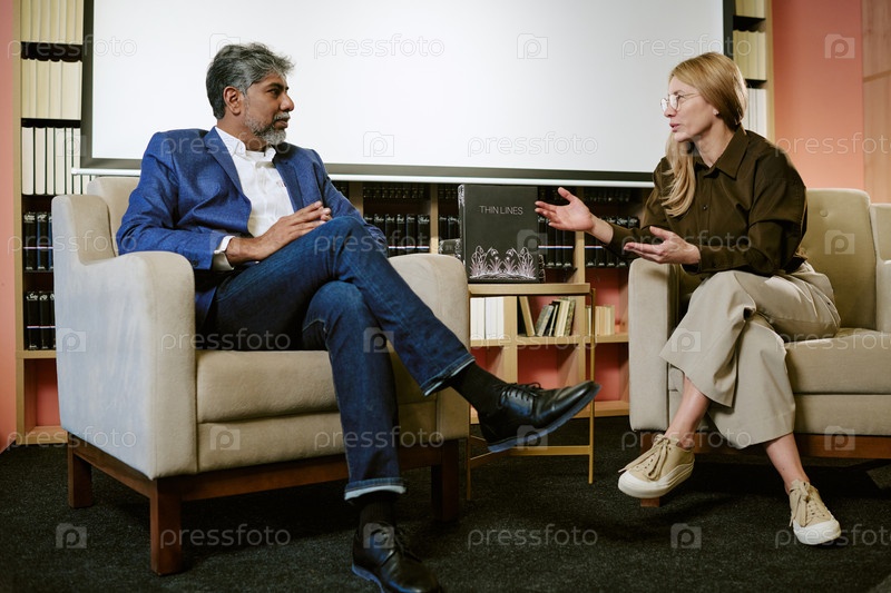 Кавказская женщина средних лет и мужчина средних лет обсуждают книгу на презентации