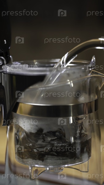 Современный чайник, который подчеркивает процесс заваривания восхитительного чая с горячей водой и свободными листьями