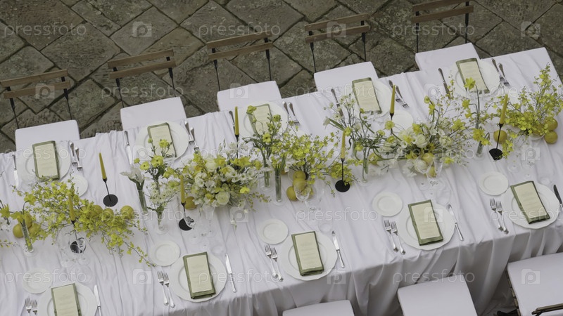 Элегантная белая столовая обстановка с желтыми цветами и лимонами
