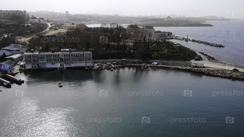 Вид с воздуха, летящий над небольшой прибрежной гаванью с лодками