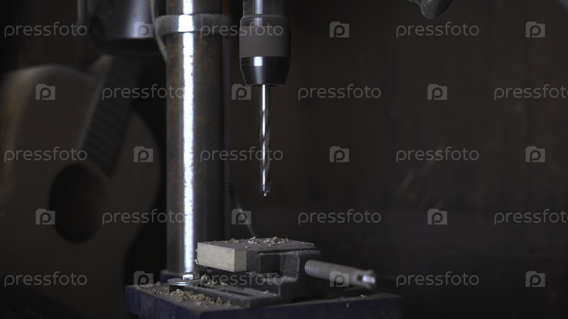 Плотник пробуривает древесину с помощью буровой прессы.СМИ