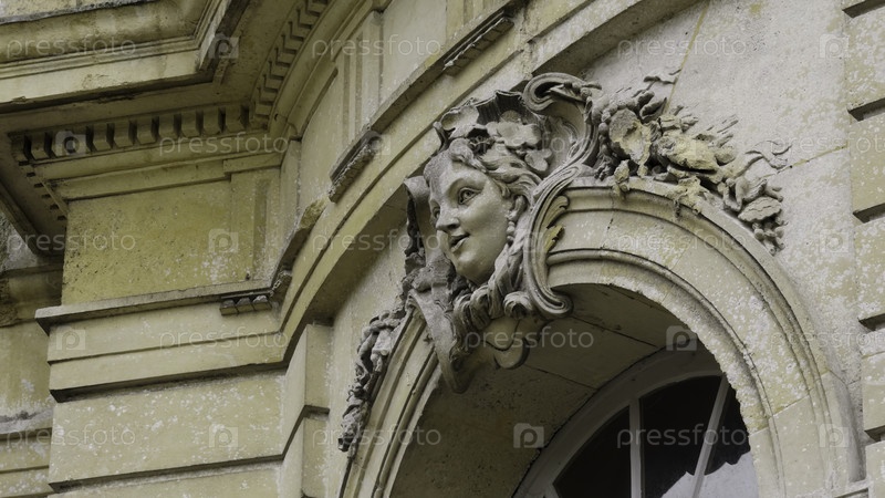 Скульптуры каменного лица женщины украшают окно французского замка
