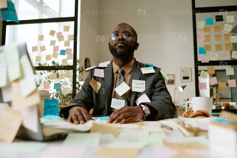 Чернокожий мужчина работает за столом, окруженный клейкими записками в офисе