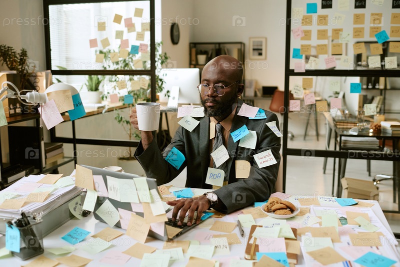 Чернокожий мужчина, работающий за рабочим столом и покрытый клейкими записками в офисе