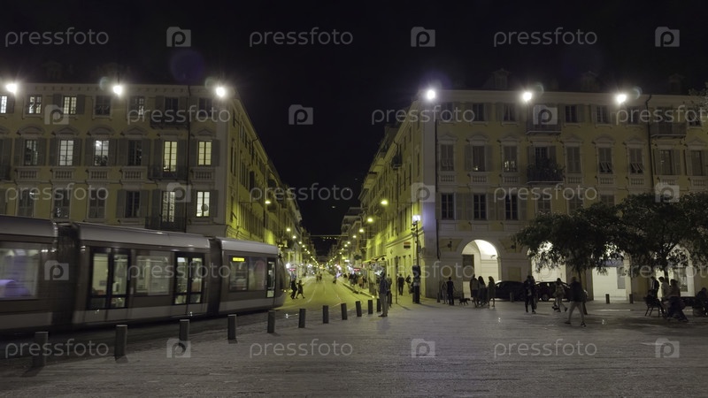 Современный трамвай проходит через площадь Гарибальди в Ницце ночью