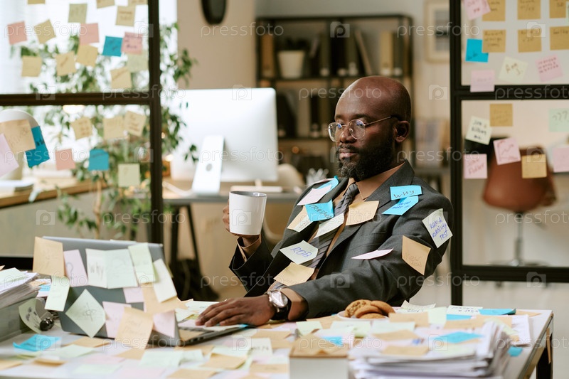 Чернокожий человек контролирует сроки реализации проекта, выпивая кофе на работе