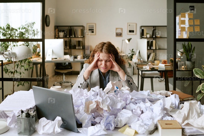 Молодая женщина борется с перегрузкой бумажной работой на офисном столе