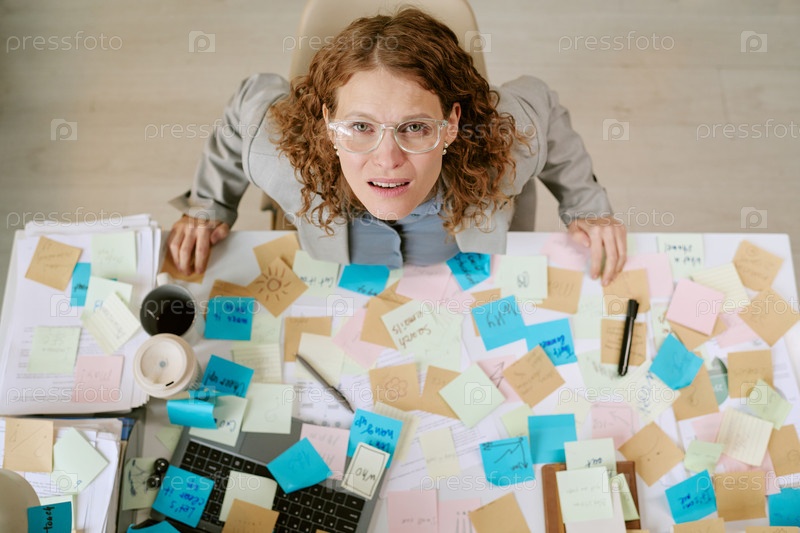 Портрет стрессовой женщины, справляющейся с подавляющими офисными задачами