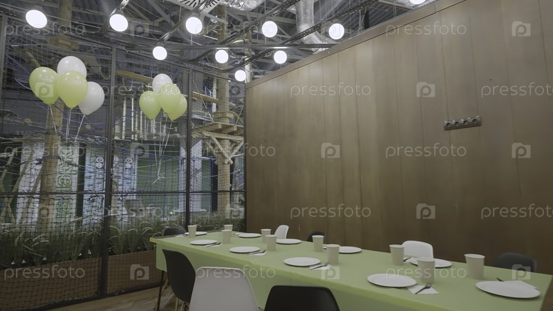 Стильная обеденная зона с яркими зелеными акцентами и причудливыми воздушными шарами, идеально подходит для собраний и торжеств
