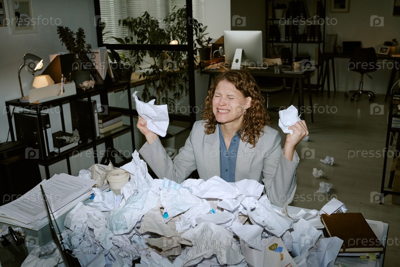 Молодая женщина, испытывающая стресс в окружении скрученных бумаг