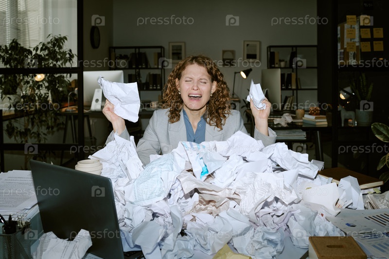 Стрессованная молодая женщина сидит за рабочим столом, справляется с бумажной работой