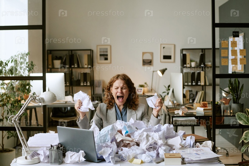 Молодая женщина, напрягающаяся из-за бумажной работы на рабочем столе в офисе Кричит