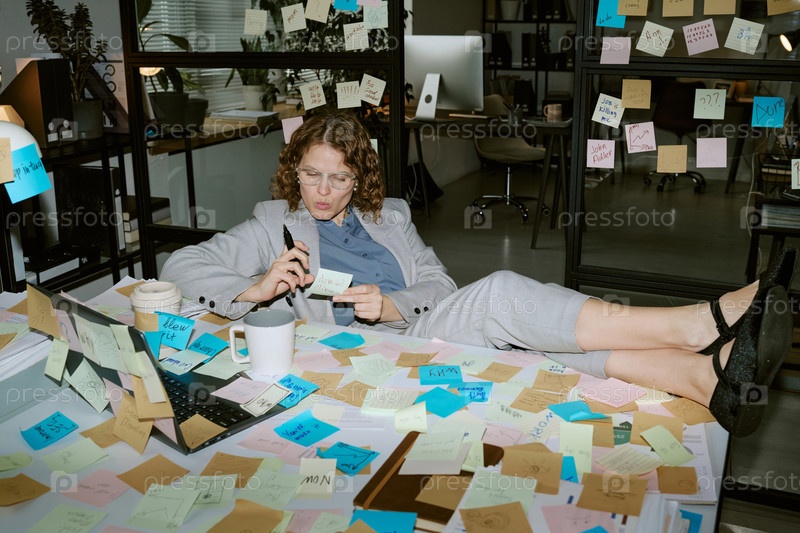 Молодая белая женщина мозговой штурм идей во время работы в офисе