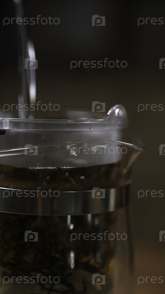 Близкий снимок ярких листьев чая в инфузере, подчеркивающий искусство заваривания восхитительных чайных смесей