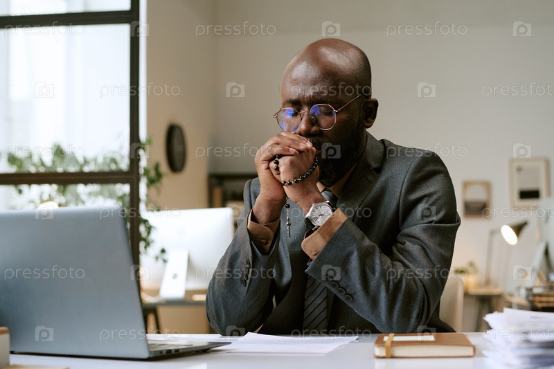 Чернокожий мужчина молится, работая над бизнес-стратегией на рабочем столе