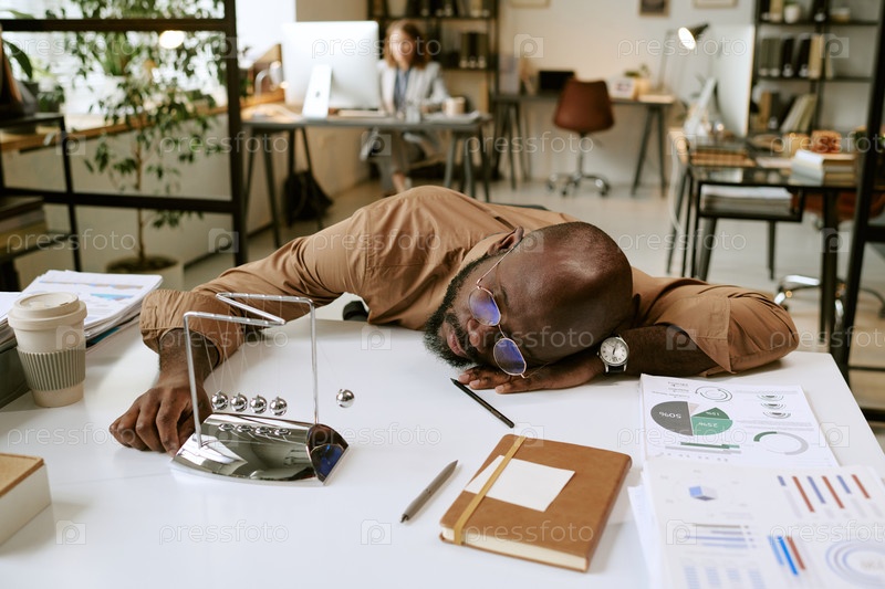 Чернокожий человек отдыхает за столом во время рабочего дня в офисе
