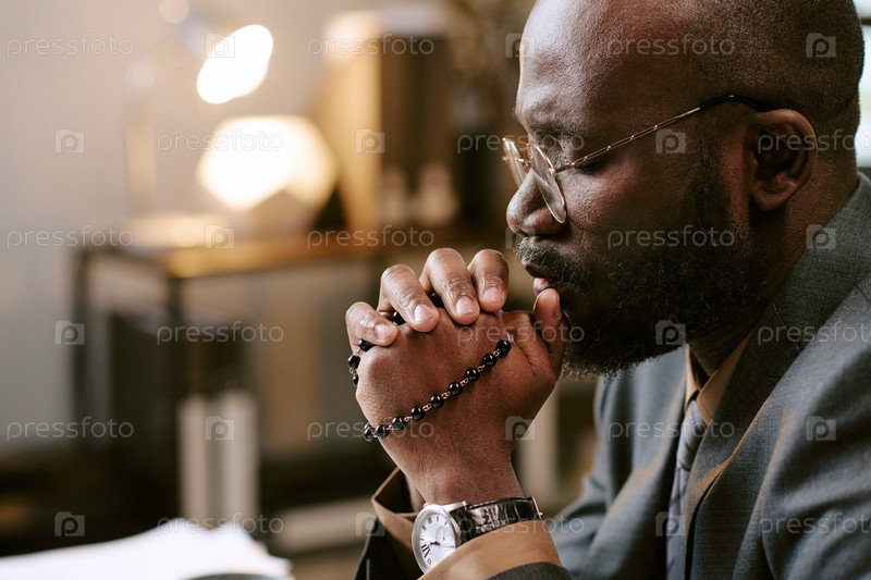 Черный мужчина молится с розариями в руках в офисной обстановке