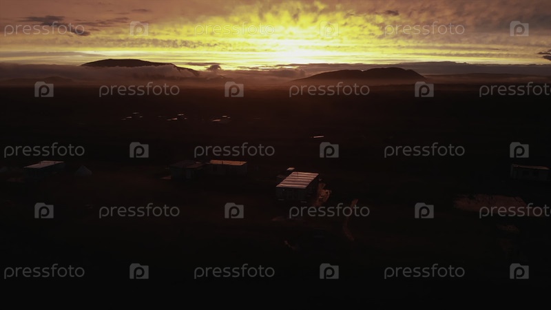Вид с воздуха отдаленной деревни во время заката солнца в золотое время суток