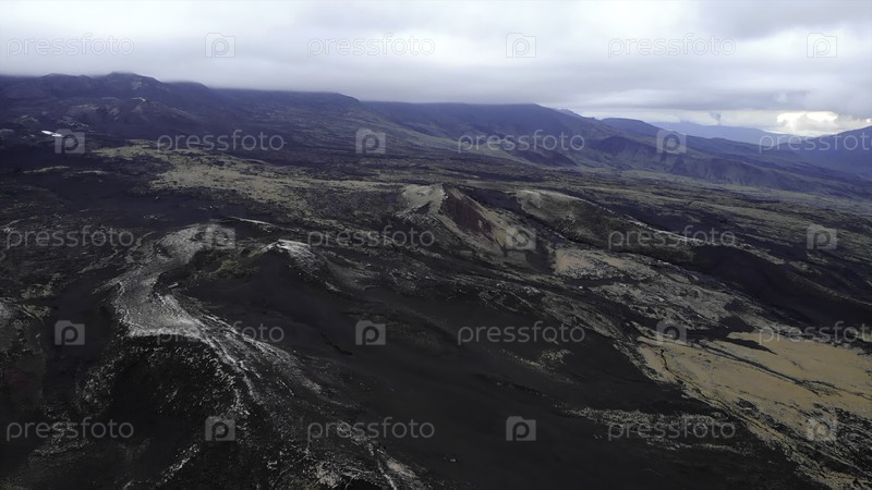 Вид с воздуха, летящий над бесплодным вулканическим ландшафтом