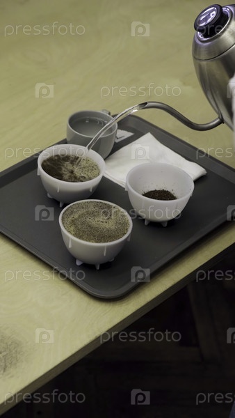 Подробный и всеобъемлющий взгляд на кофейные чашки с дегустационными кружками, готовыми к процессу заваривания.СМИ