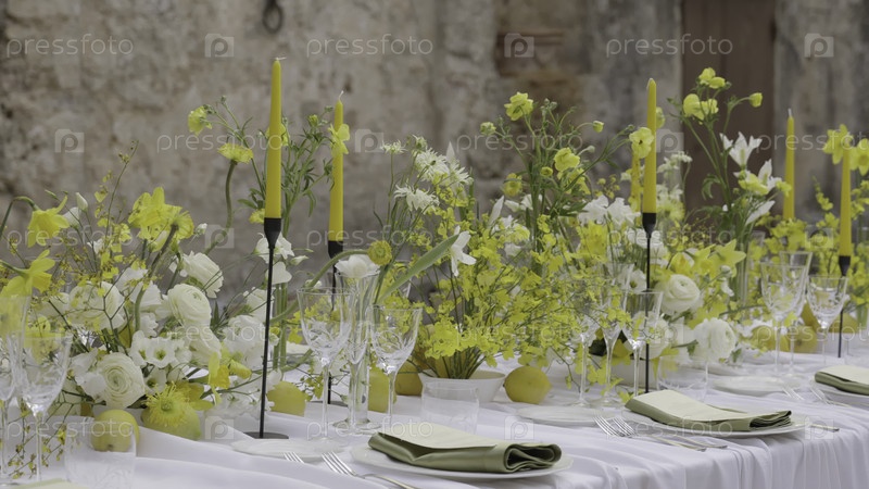 Элегантный свадебный стол, украшенный желтыми цветами и лимонами