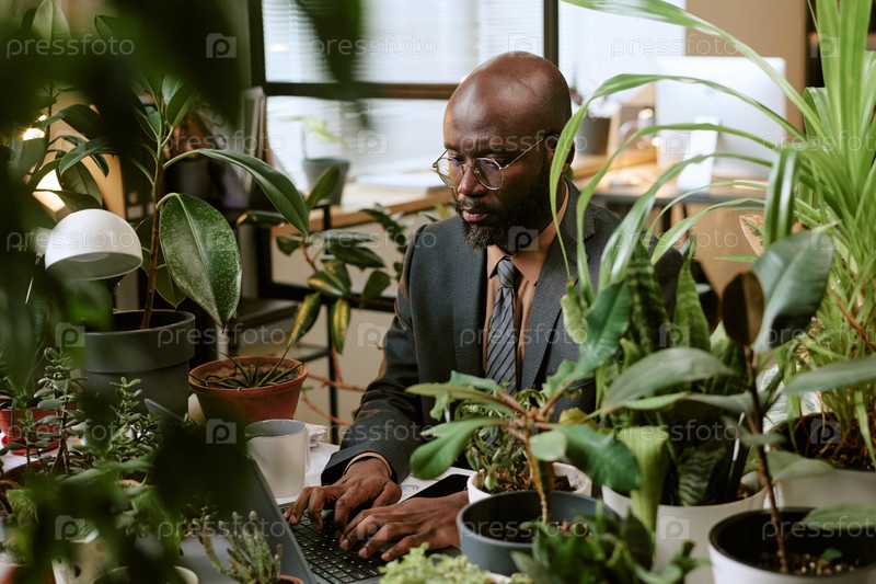 Чернокожий мужчина работает на ноутбуке, окруженный комнатными растениями в офисе