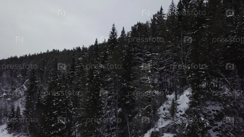 Потрясающий и спокойный снежный скалистый ландшафт с величественными вечнозелеными деревьями