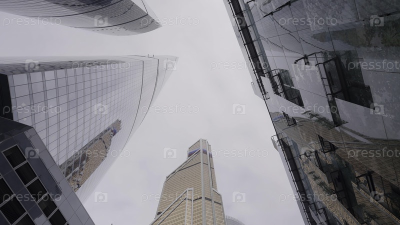 Высокий небоскреб, заметно виденный с уровня земли и окруженный различными современными зданиями города