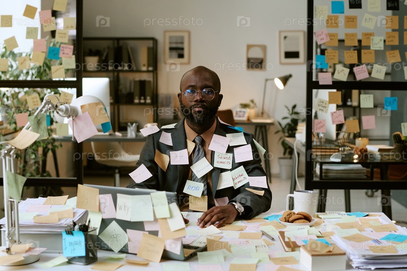 Портрет чернокожего мужчины, работающего за рабочим столом и покрытого клейкими записками