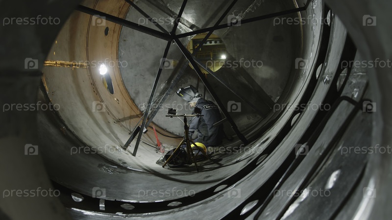Опытный работник проводит критическое обслуживание внутри большого промышленного бака, жизненно важного для общей работы