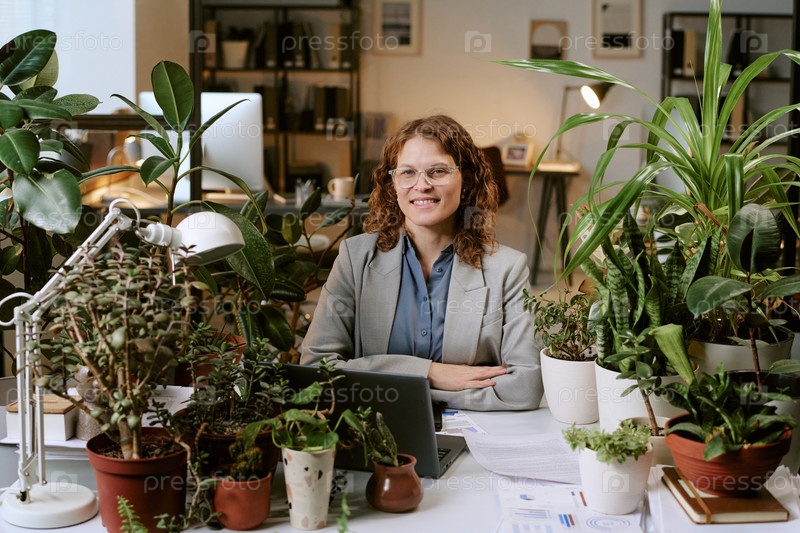 Портрет уверенной женщины, улыбающейся во время работы в биофилическом офисе