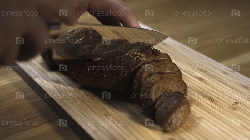 Человек нарезает свежий ржаной хлеб на режущей доске