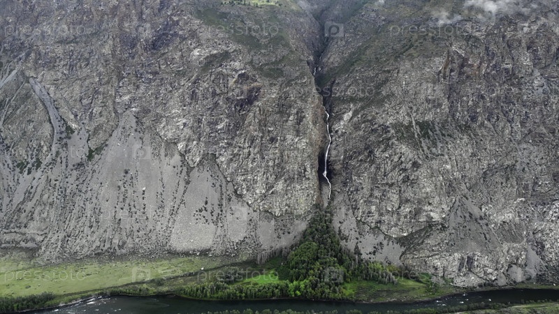 Водопад, каскадирующий в долину между горами в республике Алтай