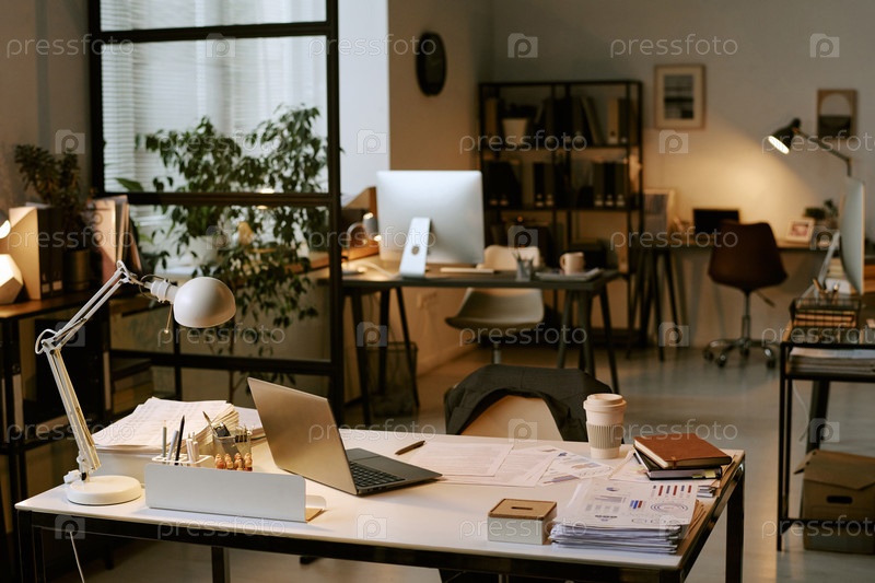 Современное рабочее пространство бизнес-офиса с ноутбуком и документами на рабочем столе