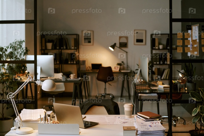 Интерьер бизнес-офиса с современными пустыми столами и рабочими станциями