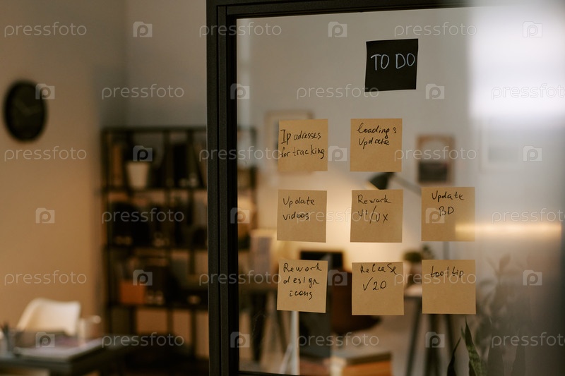 Стеклянные стеновые дисплеи для бизнеса, чтобы сделать список с наклеенными записками в современном офисе