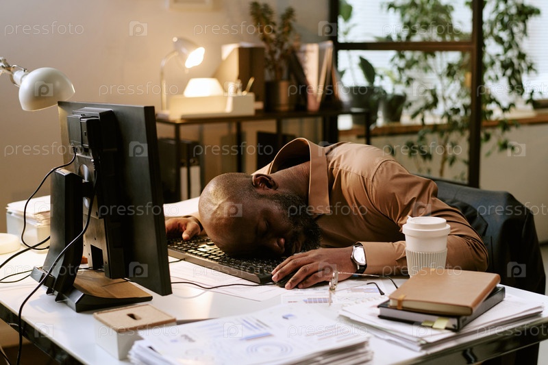 Чернокожий мужчина спит за столом во время сверхурочной работы в офисе