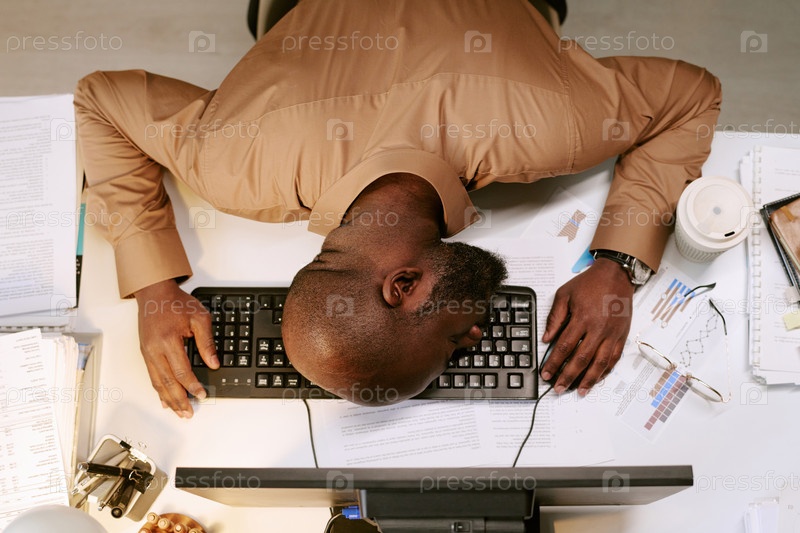 Чернокожий человек, отдыхающий головой на клавиатуре во время работы в офисе
