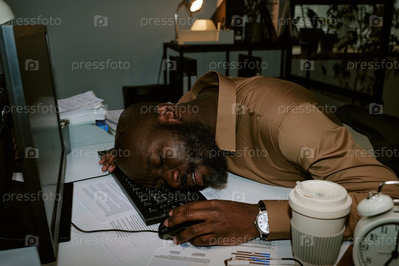 Черный мужчина дремлет на клавиатуре после изнурительного рабочего дня