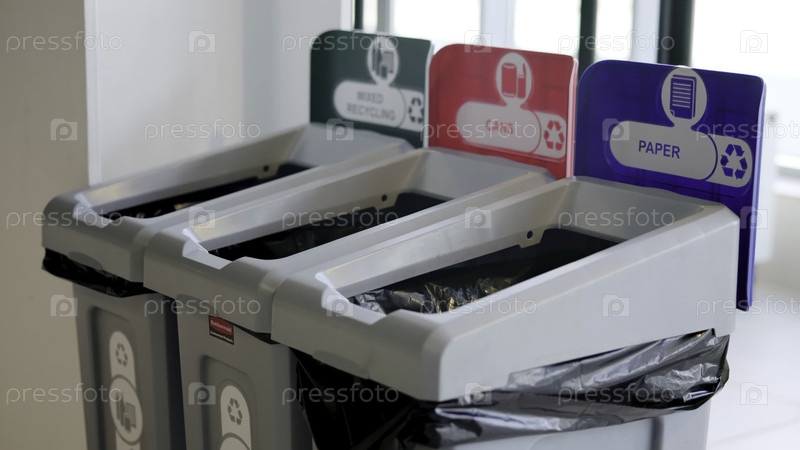 Офисный работник перерабатывает бумагу в выделенную корзину